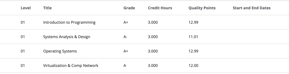 今学期受講していたのは、ネットワーク、OS、プログラミング(C#)など4科目。1コマあたり約3時間授業があるので、1科目が日本の大学の2コマ分ぐらいあります。
